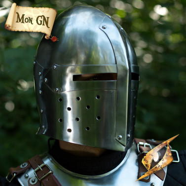 Casque barbute à visière relevable en acier doux, signé Epic Armoury, offrant un look mercenaire raffiné et une excellente protection pour vos combats et événements.