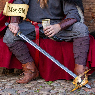 L’épée Hirdsman Vanguard s’inscrit dans une esthétique médiévale sobre et efficace, parfaite pour les personnages de fantassins, gardes ou guerriers aguerris. Avec sa longueur de 101 cm, elle offre une excellente allonge tout en restant maniable, adaptée aussi bien aux combats rangés qu’aux duels scénarisés en GN.
