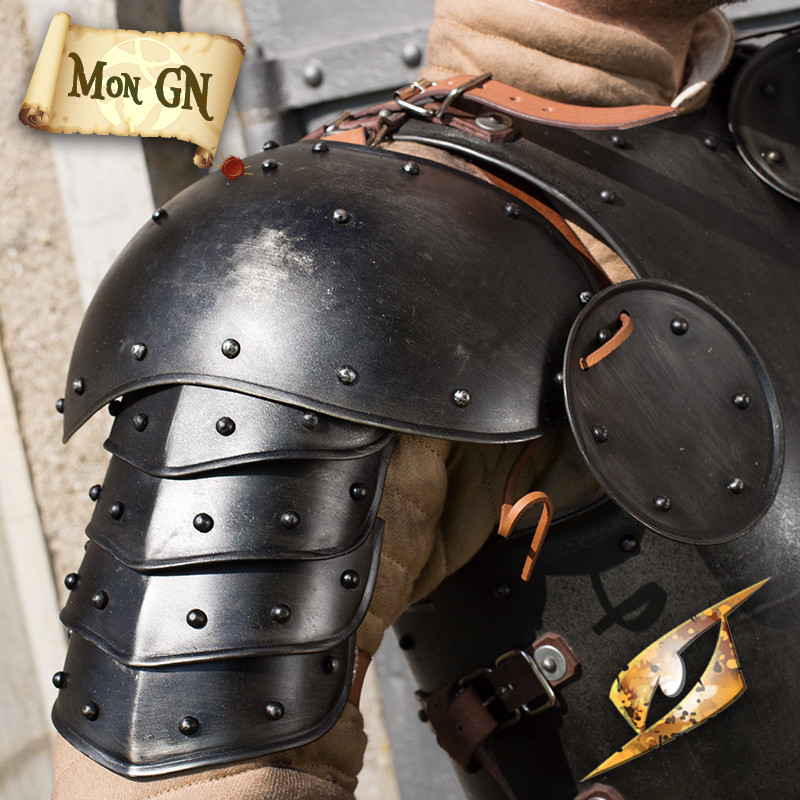 Les besagues, fixées par des lacets en cuir, renforcent les zones sensibles sans gêner les mouvements. L’ensemble se fixe solidement grâce à des sangles en cuir au niveau du biceps et de l’omoplate, permettant une intégration facile avec une cuirasse (plastron et dos non inclus).