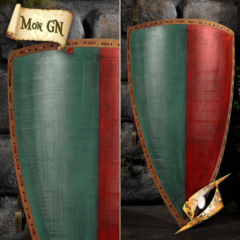 Fabriqué en mousse EVA sculptée pour imiter le bois vieilli et renforcé par un contour en cuir cousu, ce bouclier offre une protection légère et maniable. Son système de prise en main croisée en cuir permet une utilisation ambidextre, pour s’adapter à tous les styles de jeu. Grâce à sa courbure enveloppante, il est idéal pour former une ligne de défense ou charger à l’avant du champ de bataille.